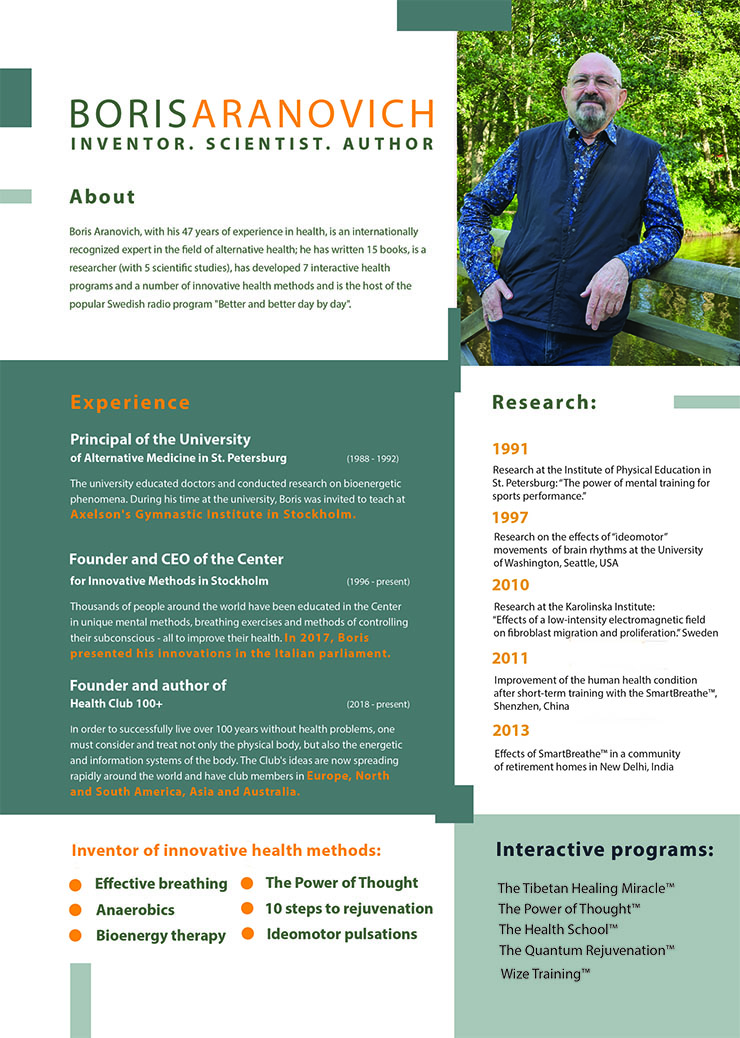 The company is led by Boris Aranovich, a medical educator, scientist, speaker, and expert in health optimization with 47 years of experience. He previously founded the University of Bioenergetic Science and taught at Axelsons Gymnastiska Institut, the leading massage and therapy school in Scandinavia.
